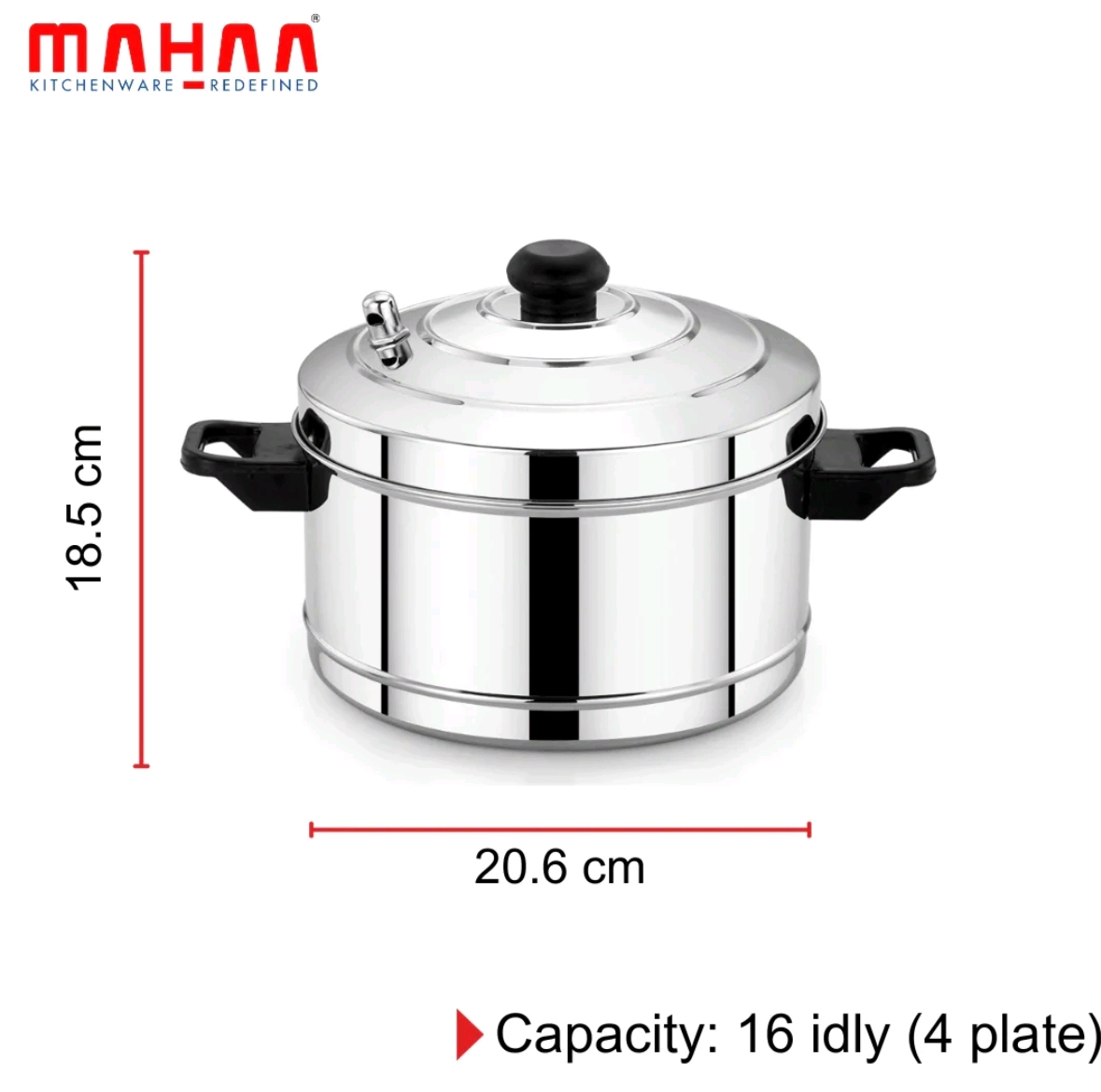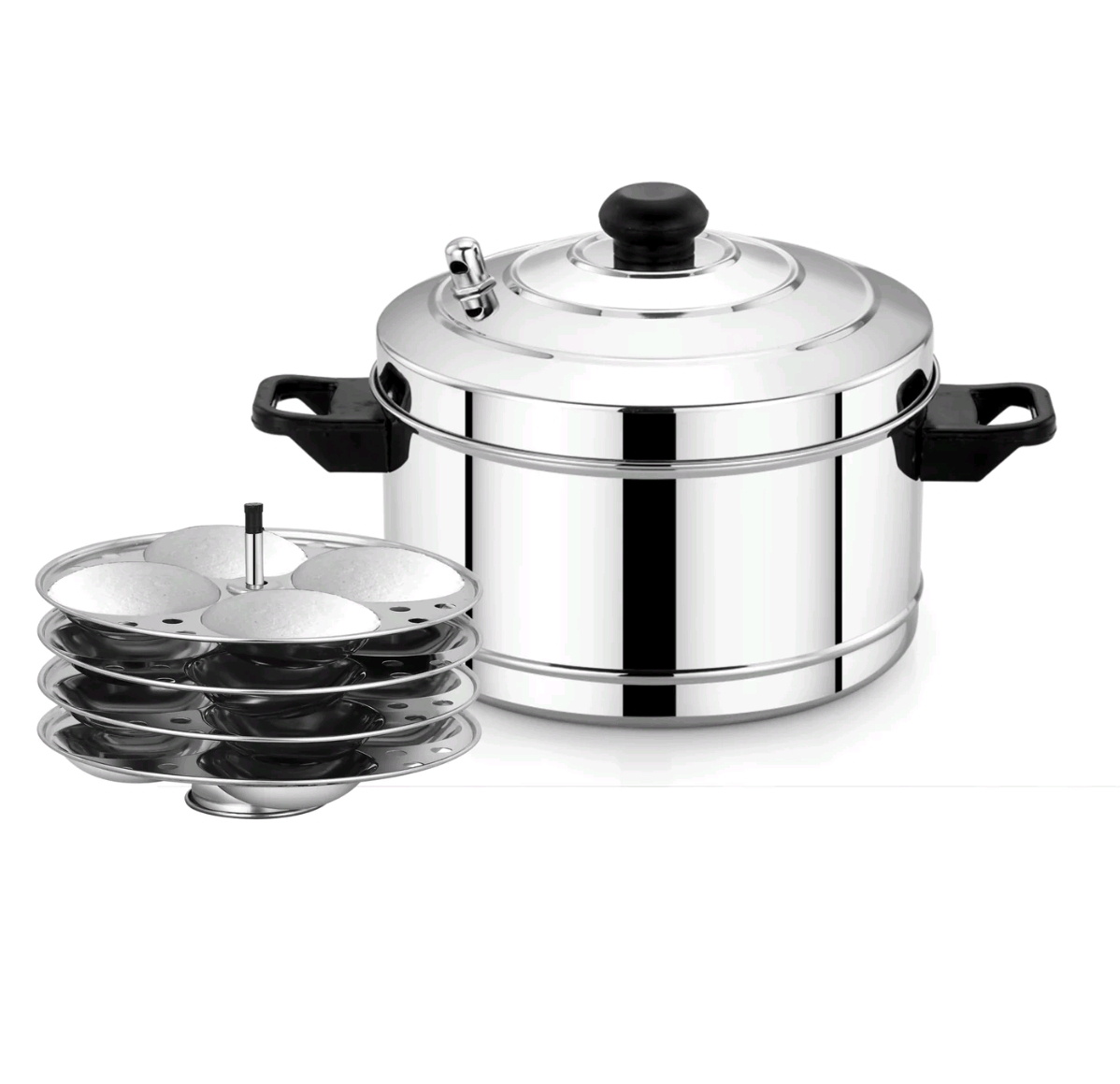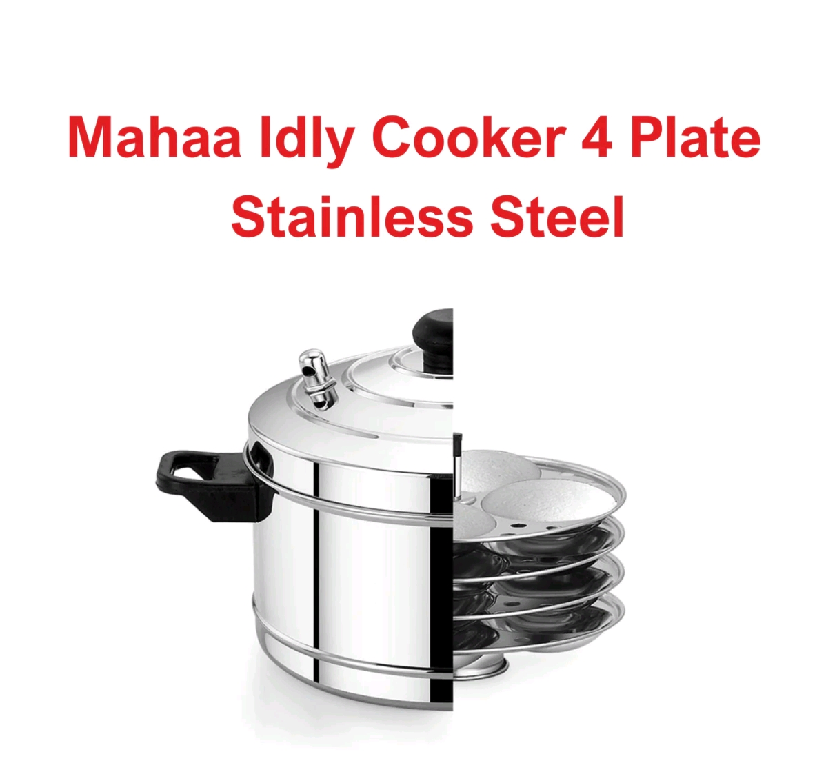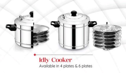 Comes with 4 idli plates, each plate holding 4 idlis. Steams quickly and evenly, compatible with both gas and induction stoves.