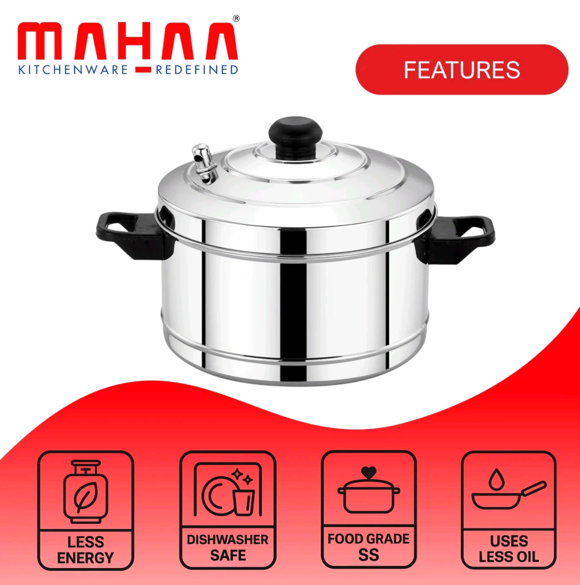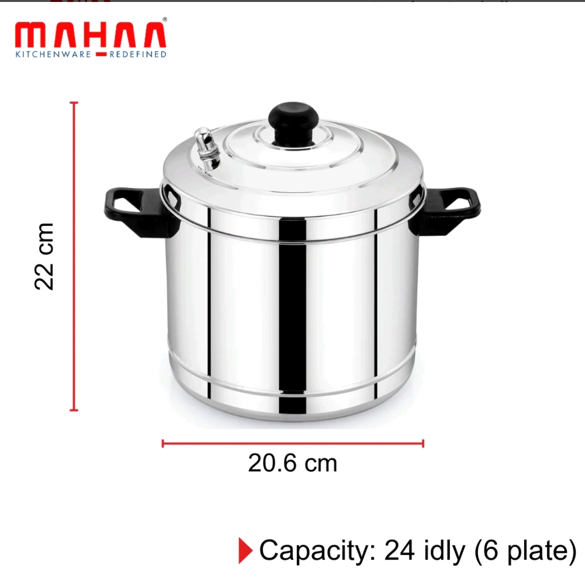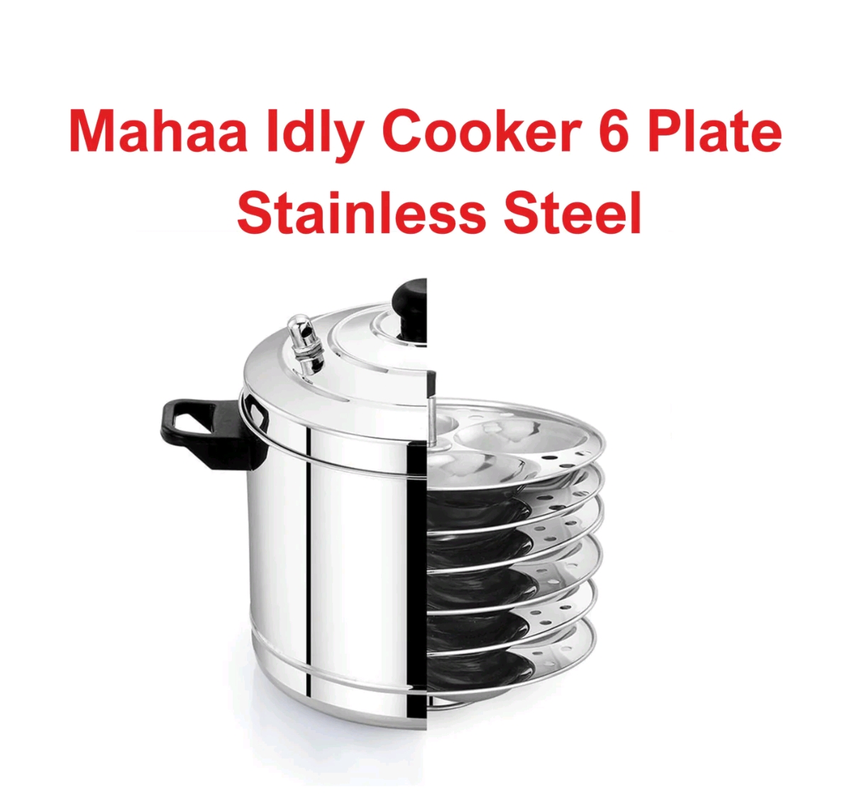 Comes with 4 idli plates, each plate holding 4 idlis. Steams quickly and evenly, compatible with both gas and induction stoves.