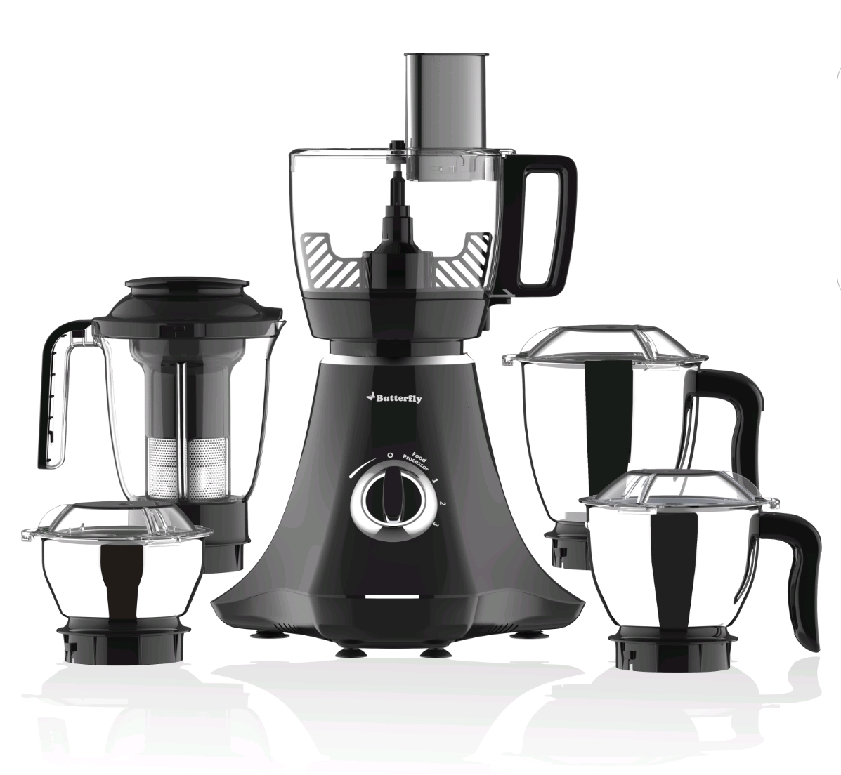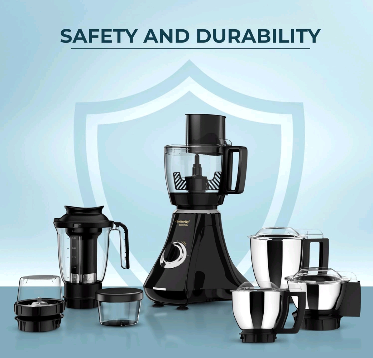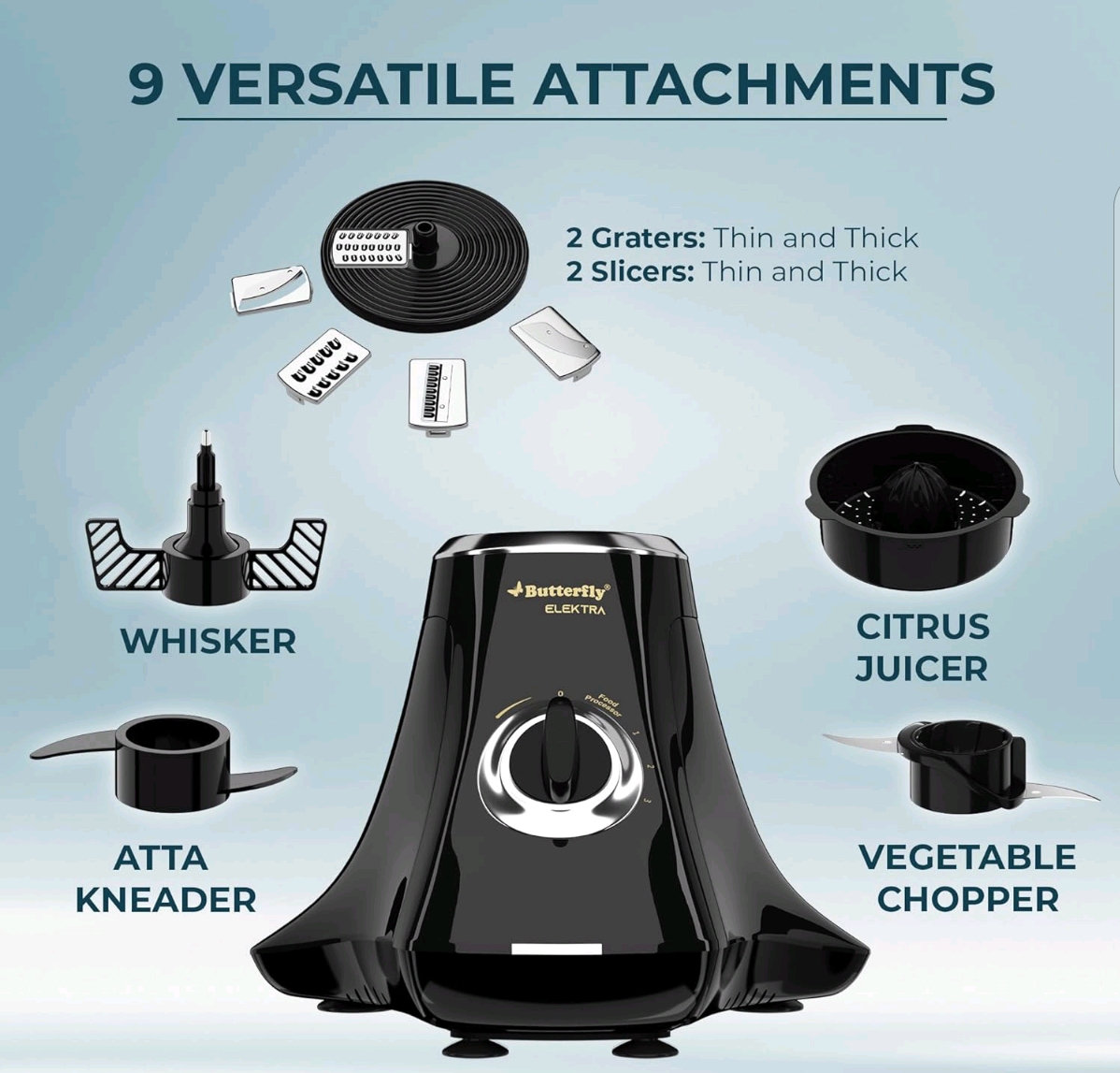 The Butterfly Elektra is a popular line of versatile kitchen appliances, primarily known as a powerful 750W (or 1HP) Food Processor/Mixer Grinder with 6-7 jars and numerous attachments (chopper, slicer, whisker, atta kneader) for grinding, blending, juicing, and dough making, featuring FPSS technology, overload protection, and LED indicators for tasks like kneading roti and making chutneys. A separate model is also available as a large capacity (7.5L) Digital Air Fryer with various cooking functions and a visible window.