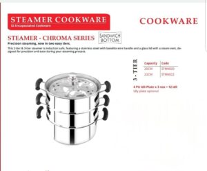 MAHAA Steamer Cookware consists ofย high-quality, food-grade stainless steel steamers designed for healthy, oil-free cooking, featuring 2-tier or 3-tier options for idlis, momos, and vegetables. These steamers have a heavy tri-ply or induction-compatible base, heat-resistant bakelite handles, and a steaming whistle for safe, efficient cooking.