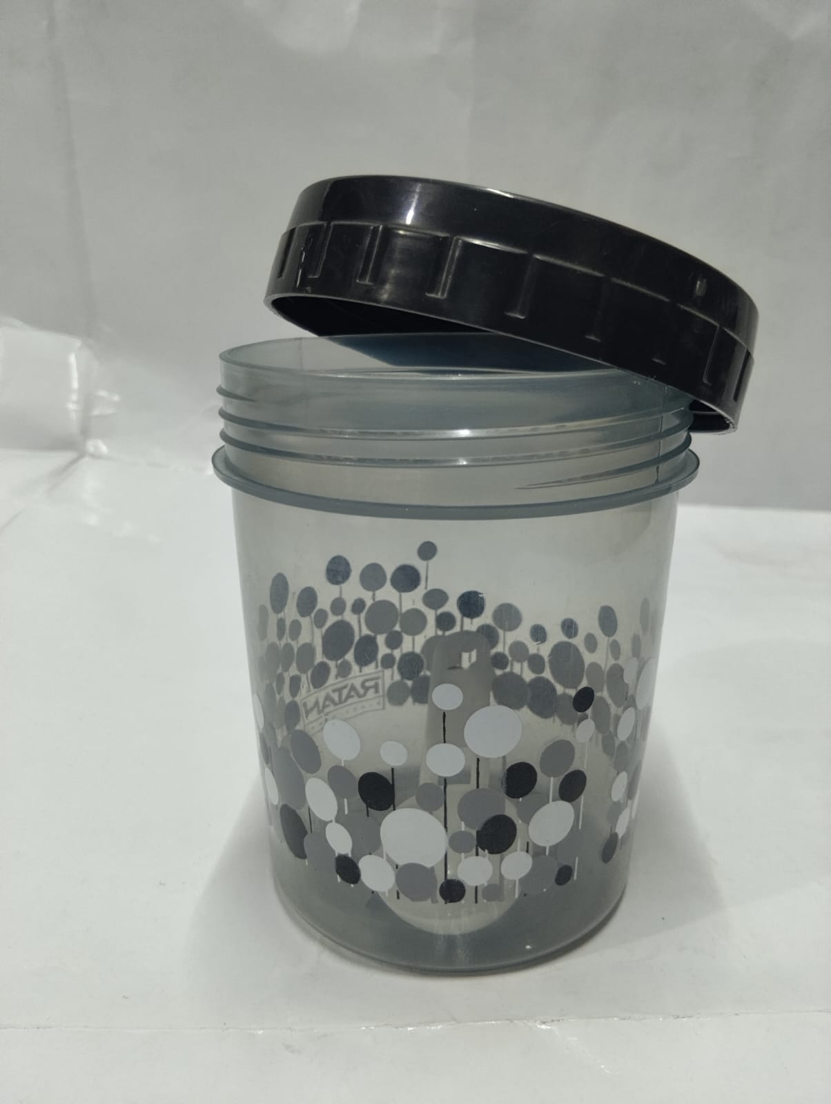 Design: Transparent body with a decorative grey/black bubble/dot pattern and solid black screw-top lids.