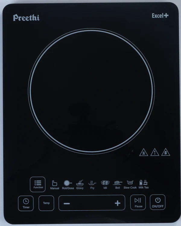 • Design:ย It features the full layout for the Excel Plus series, including the circular heating zone marking and the specificย touch panelย interface graphics for 7 preset Indian menus (Manual, Gravy, Roti/Dosa, Fry, Idli, Boil, Slow Cook, and Milk/Tea).