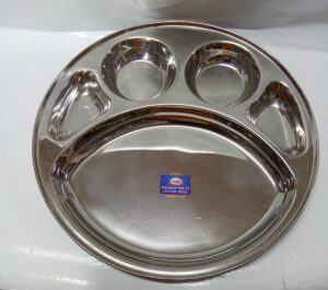 Our Stainless Steel Bojan Plate is perfect for serving meals with ease. Made from high-quality stainless steel, it features multiple compartments for organizing different food portions. The design includes one large central compartment and smaller compartments for sides or accompaniments.Extra deep plate.
