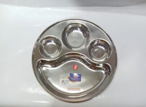 Our Stainless Steel Bojan Plate is perfect for serving meals with ease. Made from high-quality stainless steel, it features multiple compartments for organizing different food portions. The design includes one large central compartment and smaller compartments for sides or accompaniments.Extra deep plate.