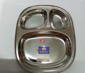 Our Stainless Steel Bojan Plate is perfect for serving meals with ease. Made from high-quality stainless steel, it features multiple compartments for organizing different food portions. The design includes one large central compartment and smaller compartments for sides or accompaniments.Extra deep plate.