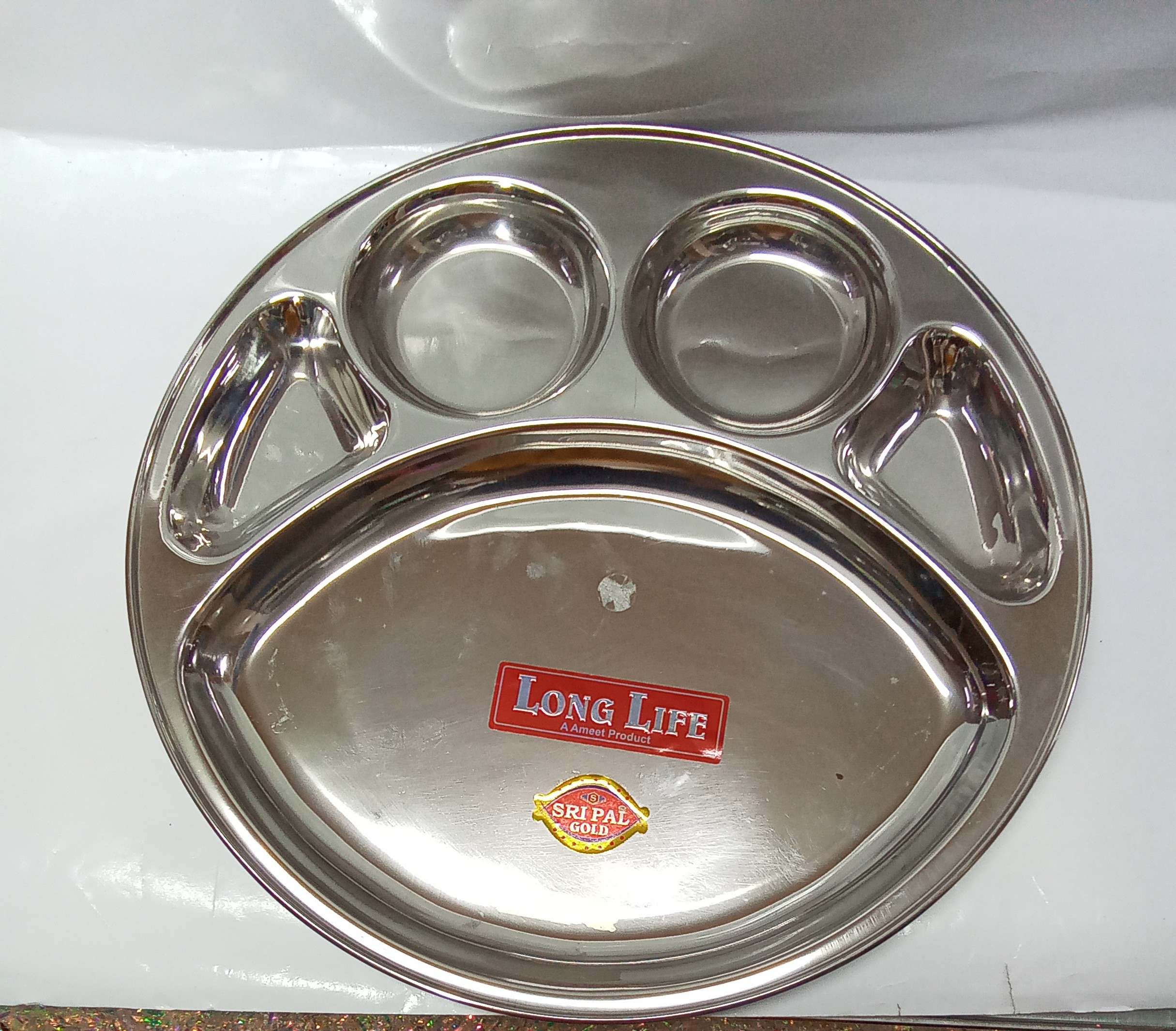 Our Stainless Steel Bojan Plate is perfect for serving meals with ease. Made from high-quality stainless steel, it features multiple compartments for organizing different food portions. The design includes one large central compartment and smaller compartments for sides or accompaniments.Extra deep plate.