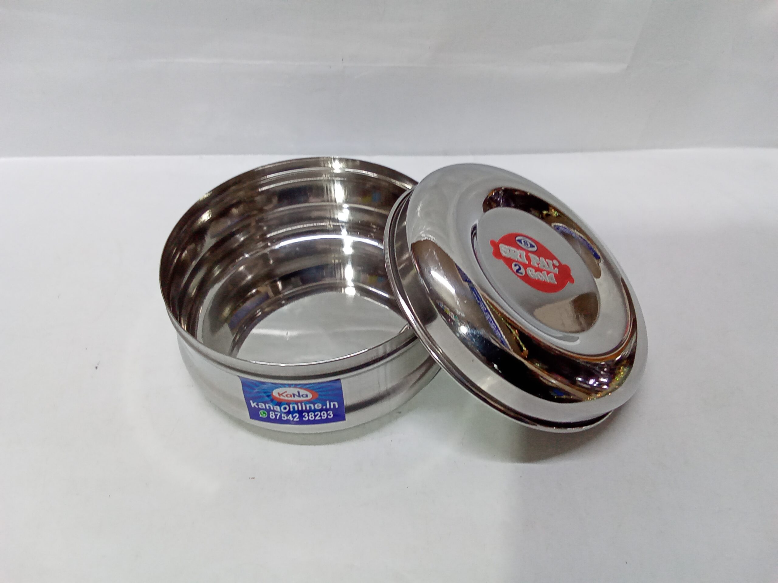 stainless steel bulging puri dabba (storage container).