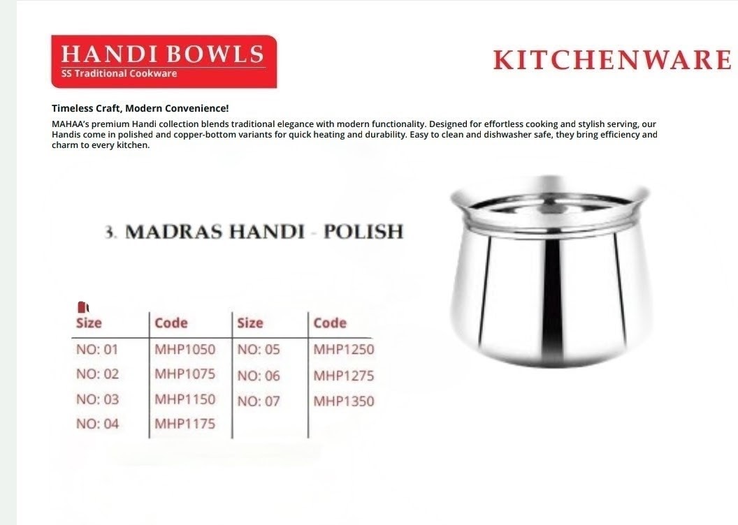 - Design:ย The “Madras Handi” has a deep, rounded (“Gundu”) body, making it ideal for cooking and serving curries, rice, biryani, and gravies.