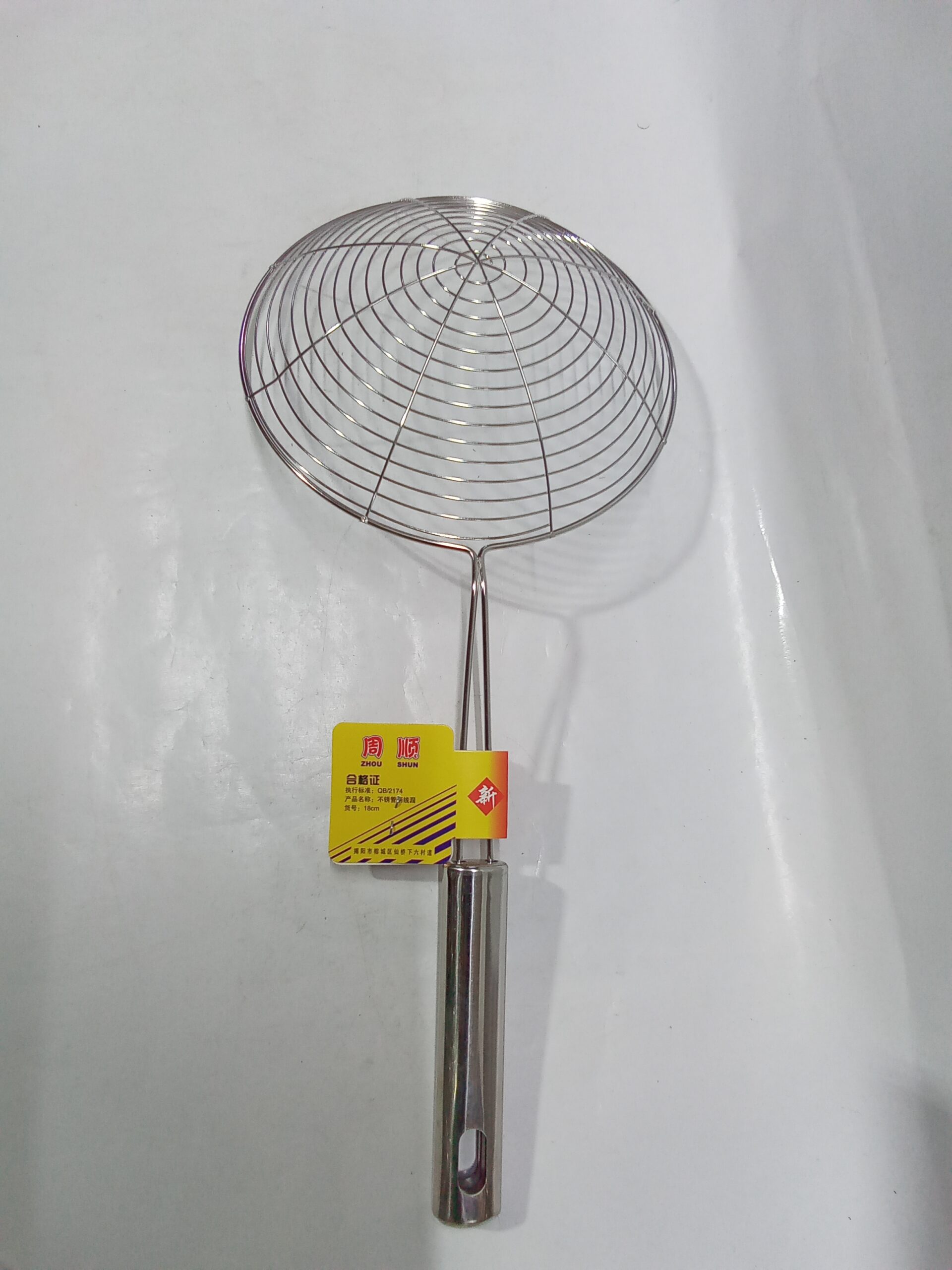 stainless steel deep fry strainer, also known as a skimmer spoon or jhara.ย It is used for lifting fried foods, noodles, or vegetables from hot oil or water.ย
