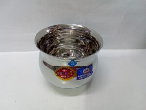 stainless steel “tope” (a type of cooking pot or container). This type of durable, rust-resistant stainless steel cookware is a common kitchen utility item in India.