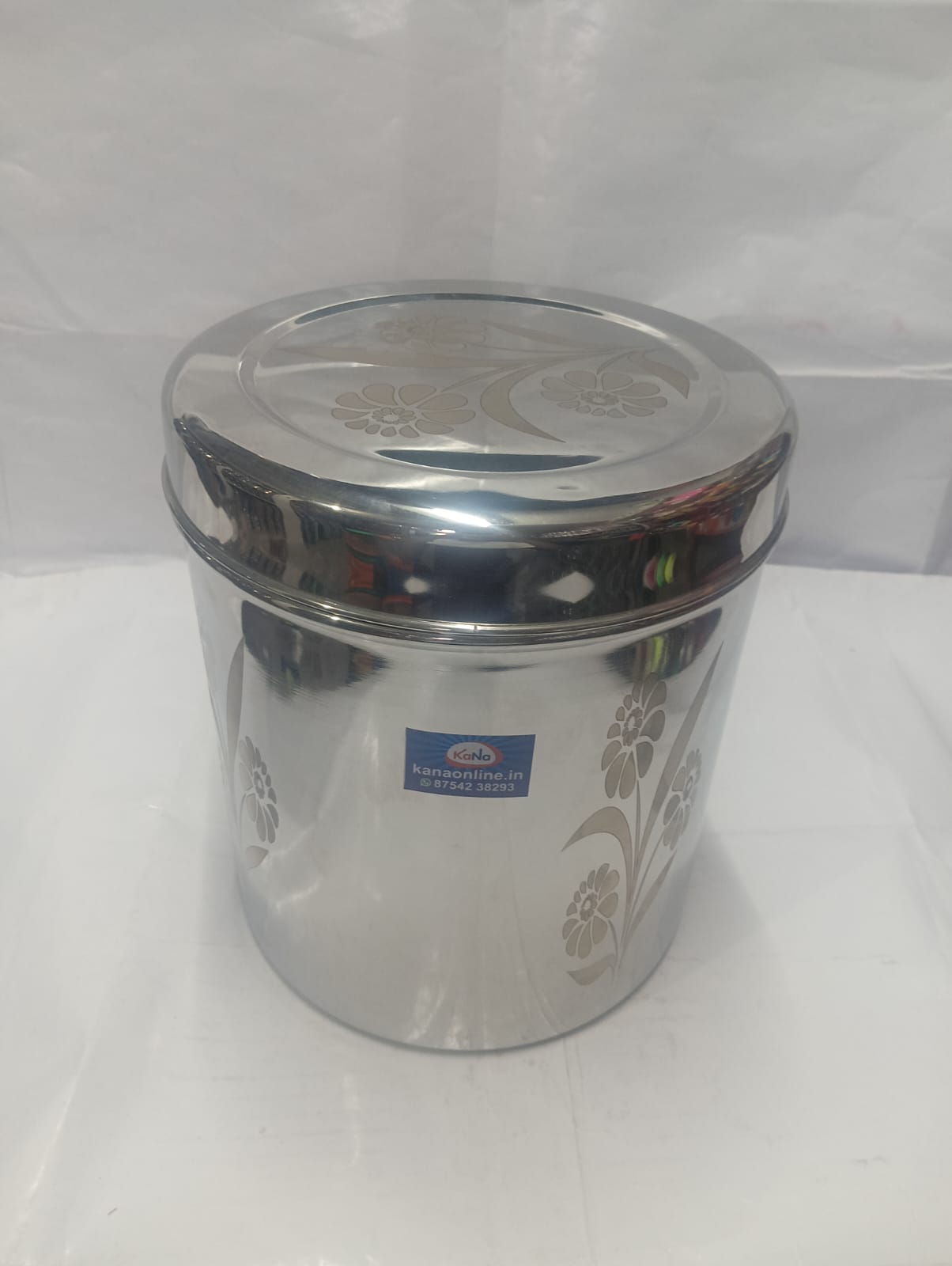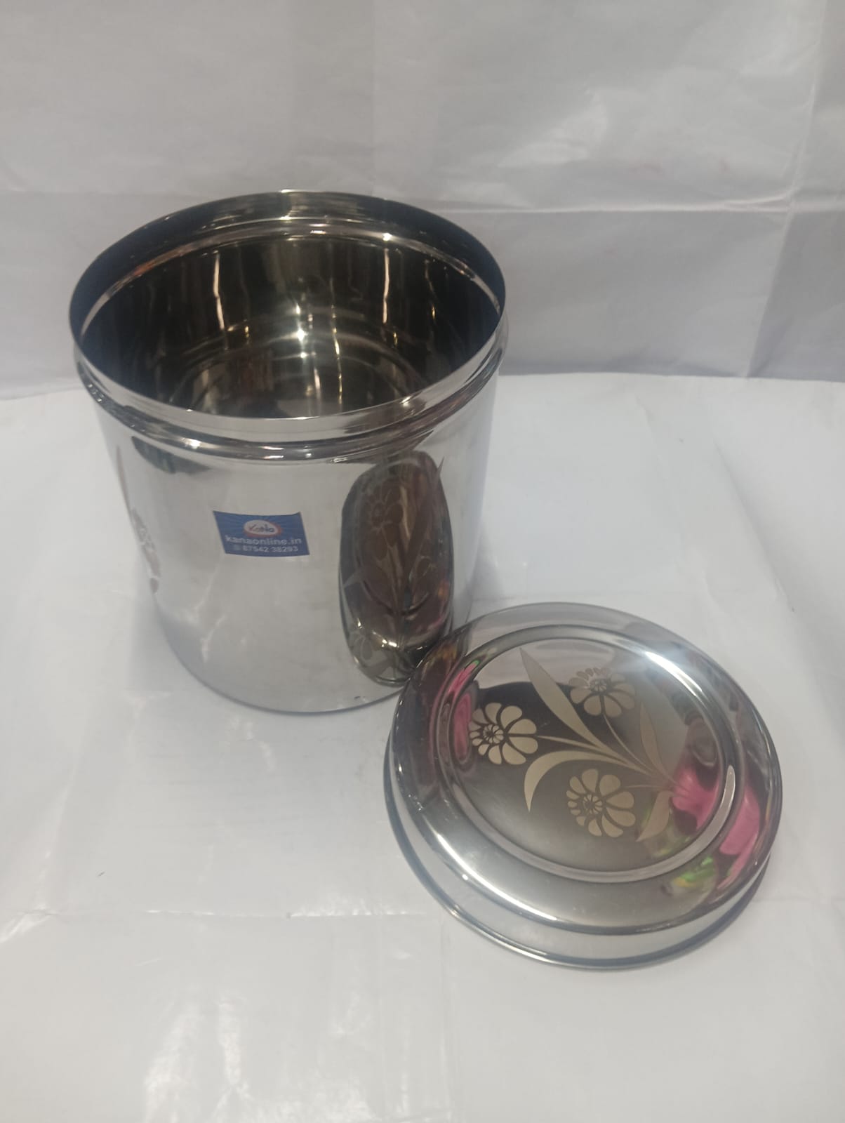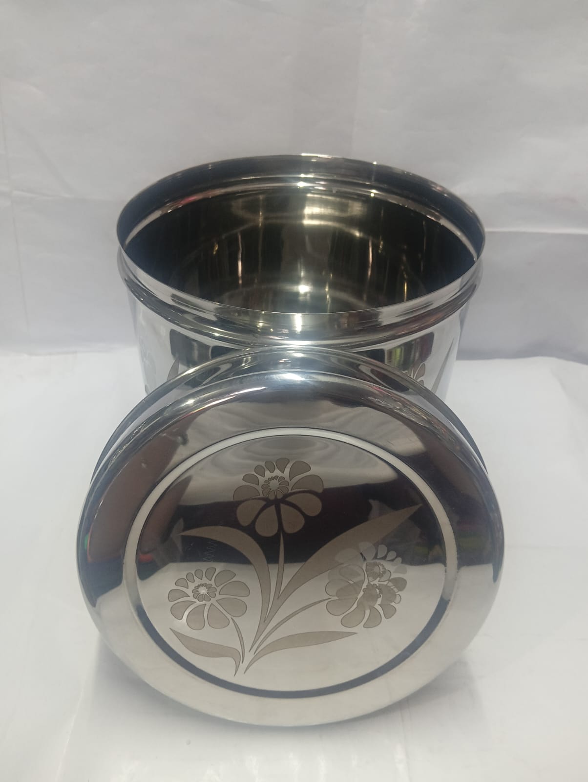 This stainless steel storage container with lid is designed for both functionality and style. Made from high-quality stainless steel, it ensures durability, rust resistance, and long-lasting performance. The container features a smooth mirror finish with elegant floral design patterns on the body and lid, adding a decorative touch to your kitchen. The tight-fitting lid helps keep contents fresh and protected from dust and moisture, making it ideal for storing rice, grains, pulses, or snacks.