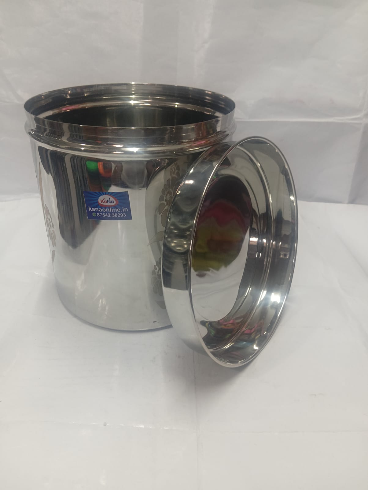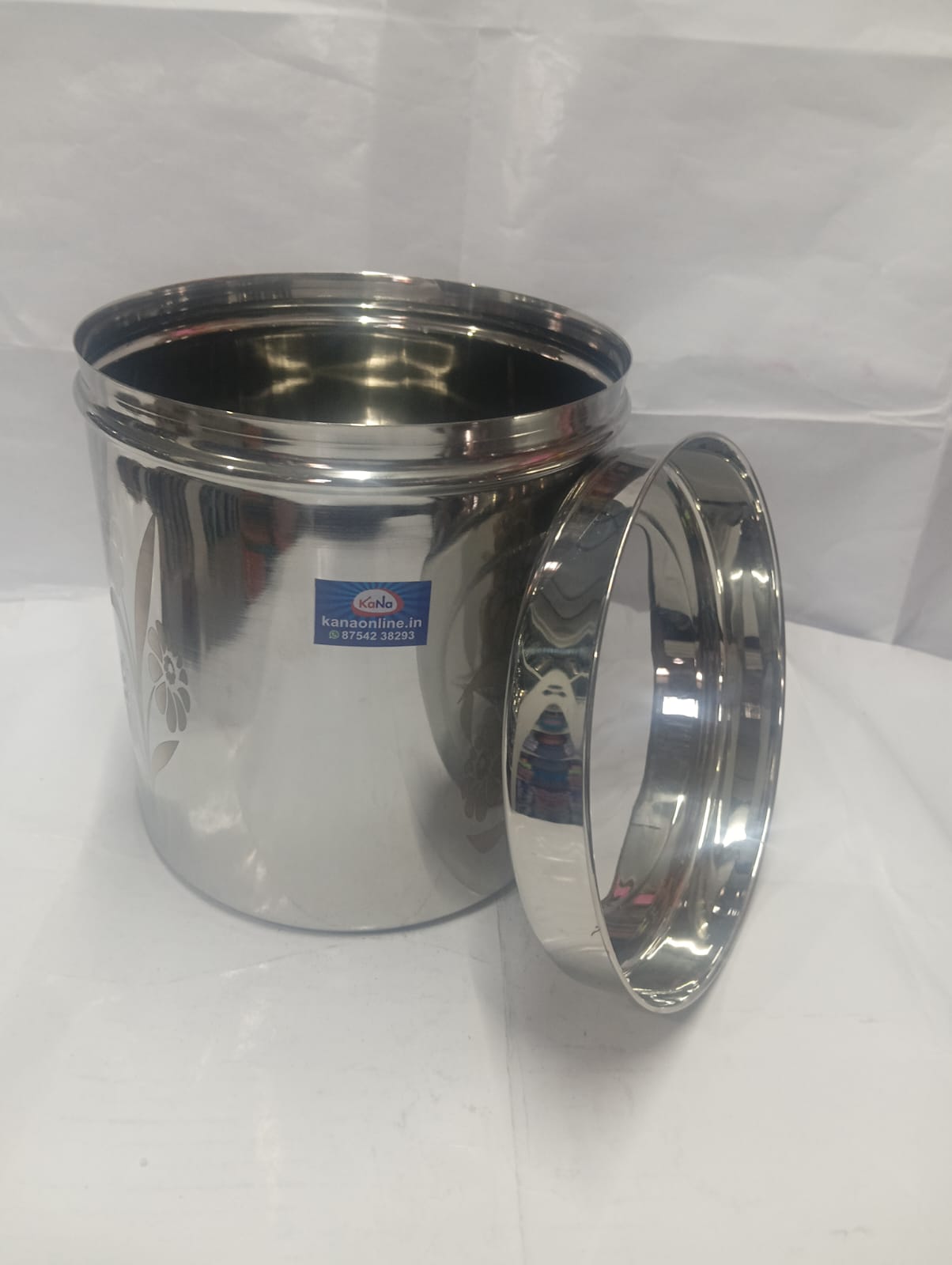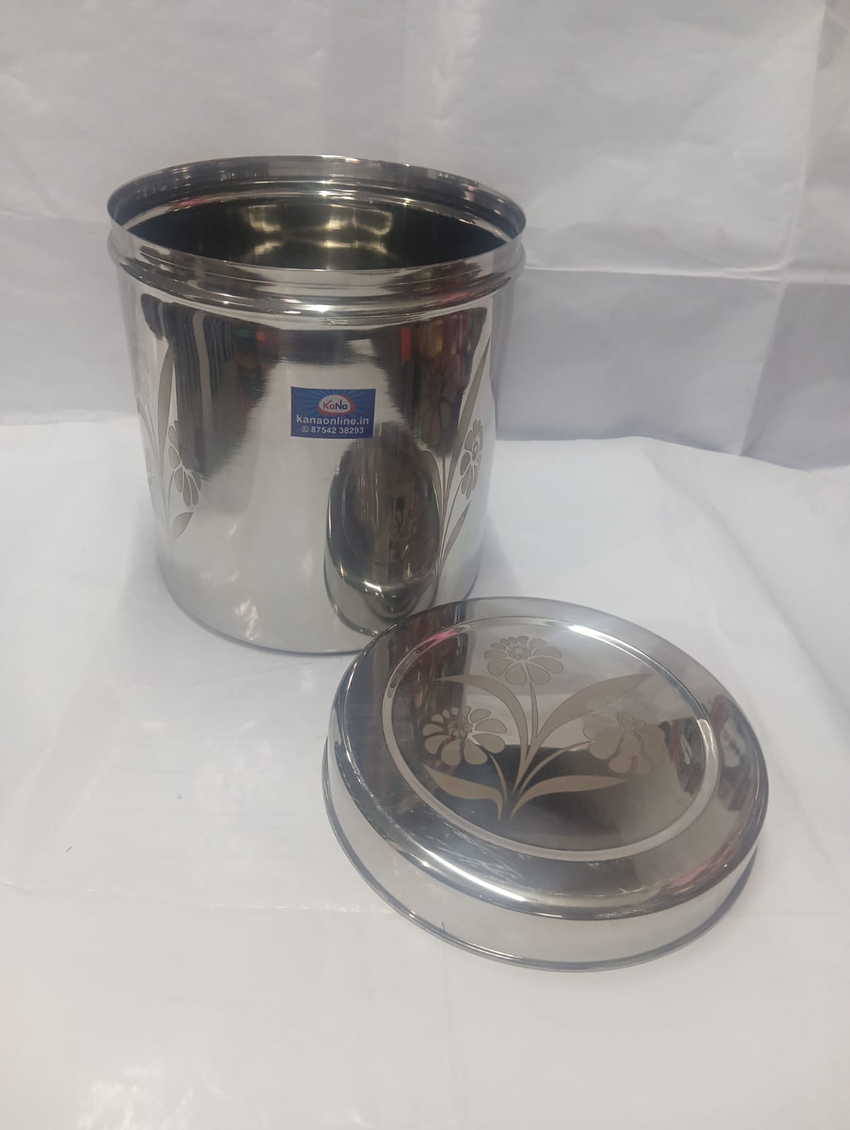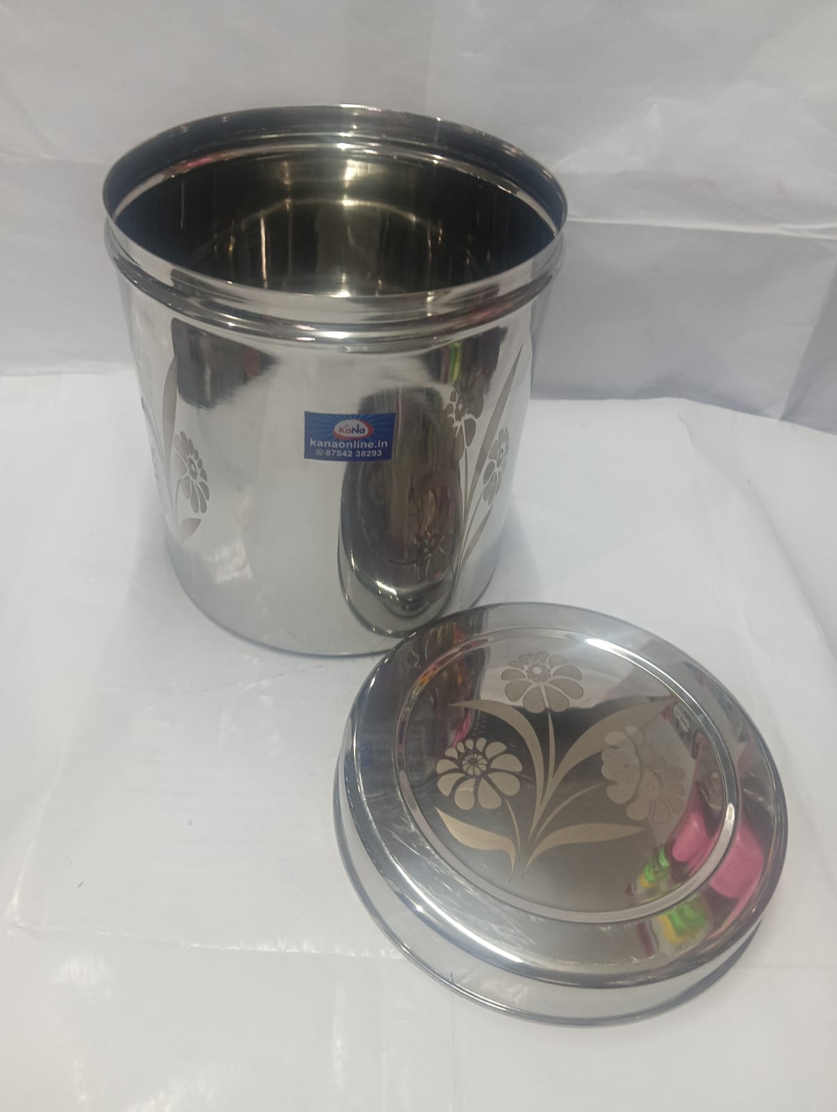This stainless steel storage container with lid is designed for both functionality and style. Made from high-quality stainless steel, it ensures durability, rust resistance, and long-lasting performance. The container features a smooth mirror finish with elegant floral design patterns on the body and lid, adding a decorative touch to your kitchen. The tight-fitting lid helps keep contents fresh and protected from dust and moisture, making it ideal for storing rice, grains, pulses, or snacks.