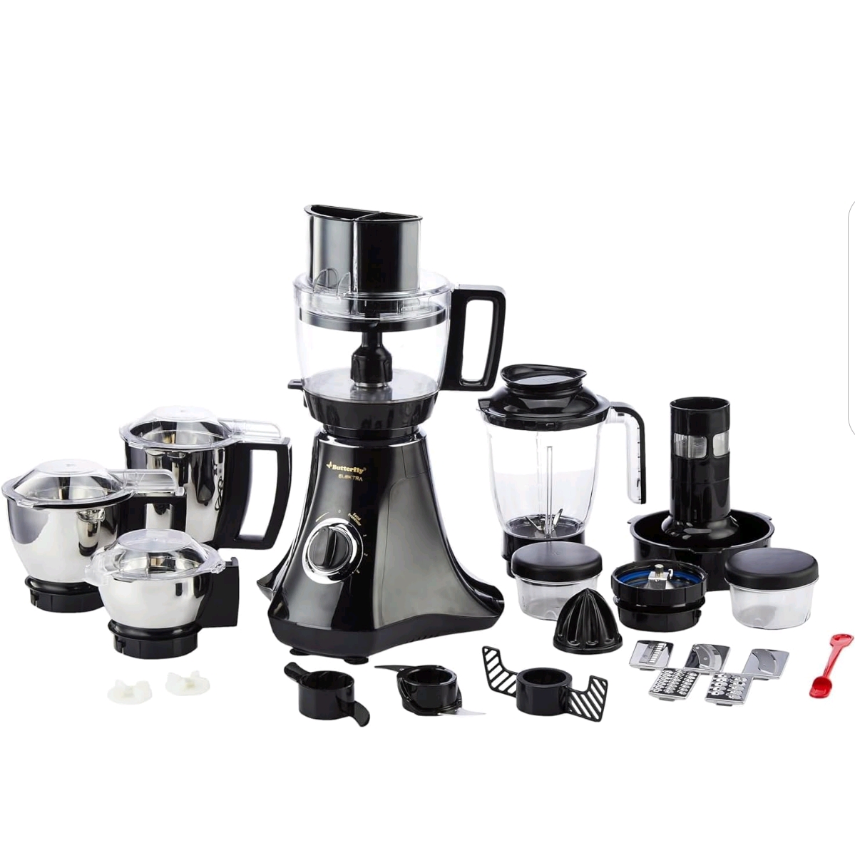 Versatility: Comes with multiple jars (stainless steel & polycarbonate) and 9 attachments for juicing, blending, chopping, slicing, grating, and kneading.