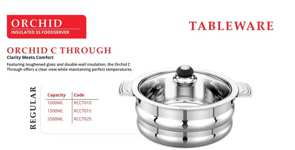 The MAHAA Orchid Regular Hot Box is a stainless steel, double-walled insulated casserole designed to keep food hot or cold for extended periods. It features a mirror-polished finish, a sturdy lid (stainless steel or glass), and heat-resistant side handles. It is ideal for serving food and maintaining freshness.