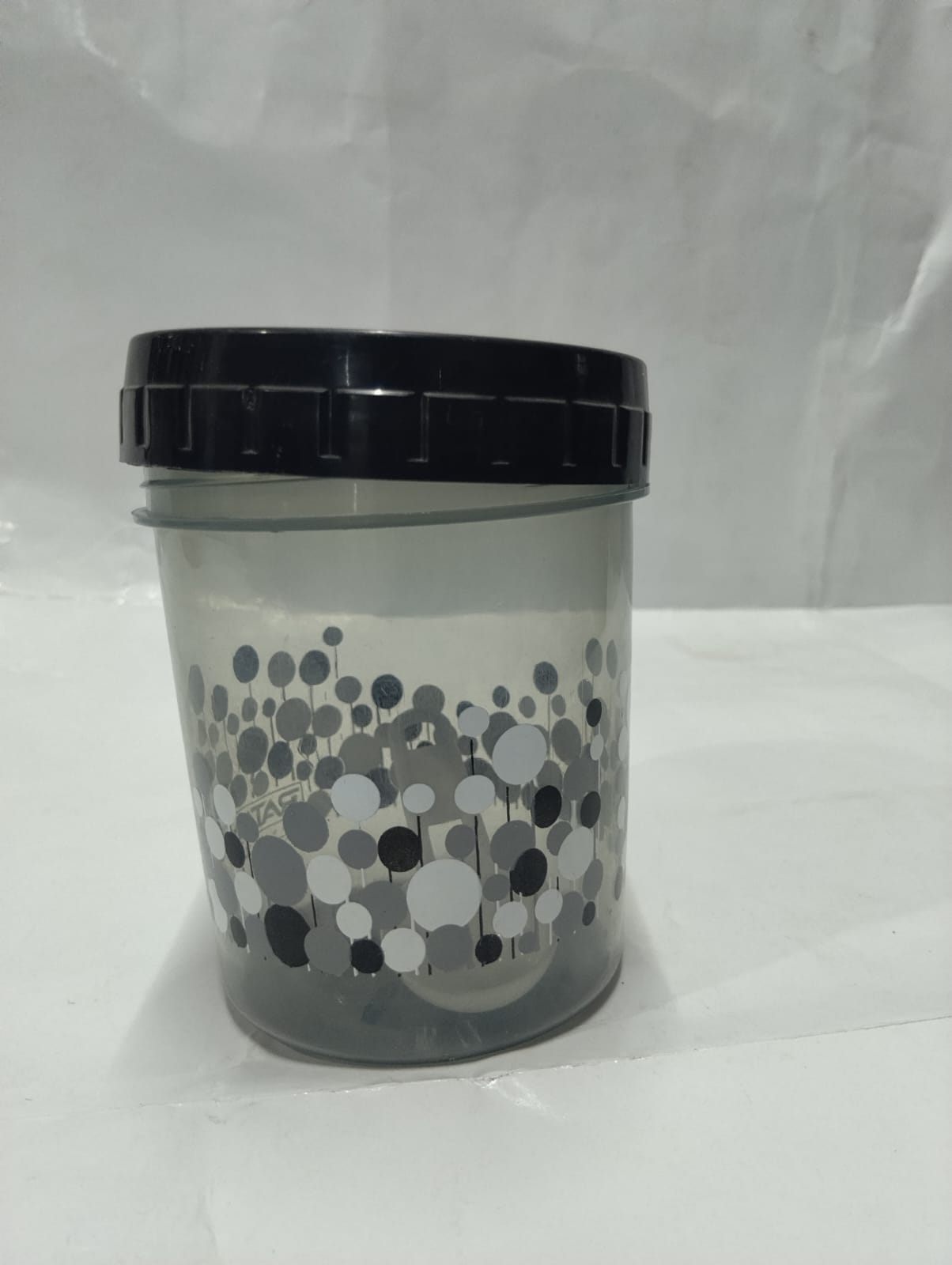 Design: Transparent body with a decorative grey/black bubble/dot pattern and solid black screw-top lids.