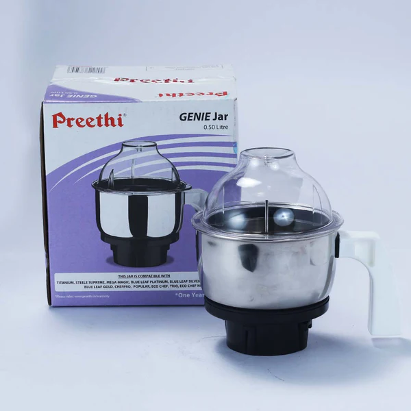 a 0.5-liter, stainless steel attachment designed for Preethi mixer grinders to perform small-scale wet/dry grinding tasks, such as chutneys and spices