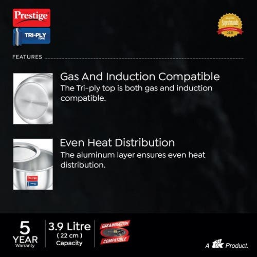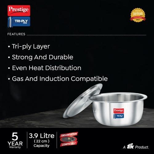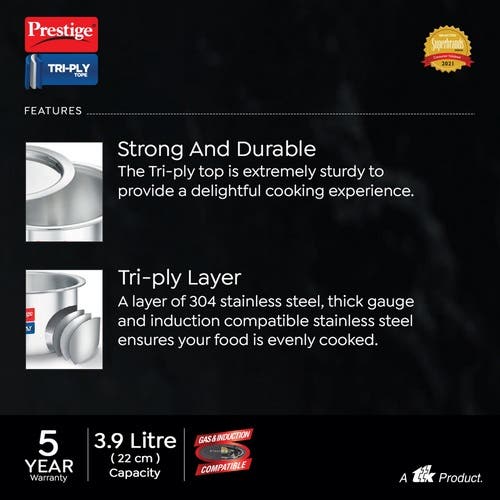 Prestige 22cm/3.9L Tri-Ply Stainless Steel Tope with Lid|Gas and Induction Compatible| Even Heat Distribution|Strong and Durable