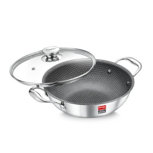 Prestige 24cm/2.7L Tri-Ply Stainless Steel Hexamagic Kadai with Lid| Honeycomb Structure| Durability of Triply| Metal Spoon Friendly| Gas and Induction Compatible| Dishwasher Safe|Low Oil Consumption|Grey