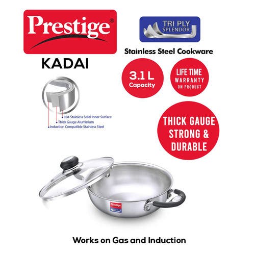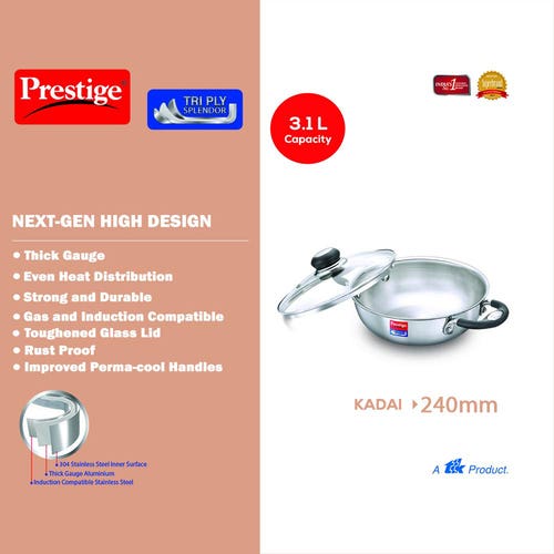 Prestige 24cm/2.7L Tri-Ply Stainless Steel Splendor Kadai with Lid| Gas & Induction Compatible| Even Heat Distribution| Strong and Durable| Perma-Cool Handles|