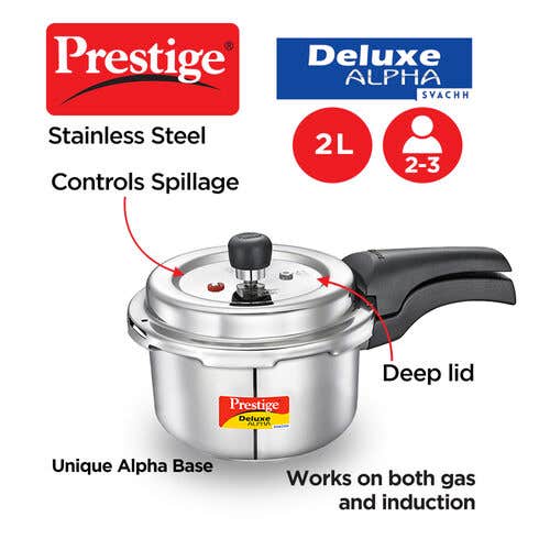 Prestige Deluxe Alpha Svachh Stainless Steel Spillage Control Pressure Cooker, 2 L (Silver)