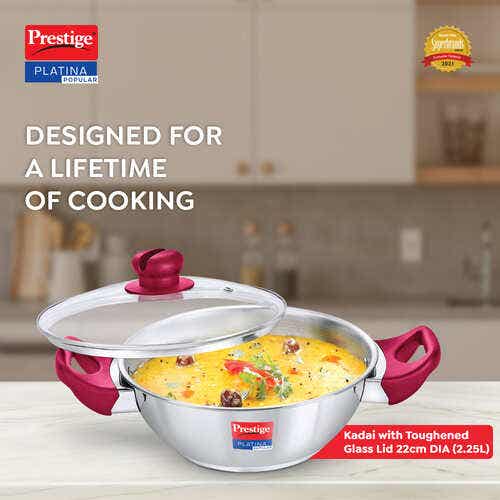 Be the first to review “Prestige Platina Popular Stainless Steel Unique Impact Forged Bottom Kadai with Toughened Glass Lid, 22cm (2.25 L) (Silver)”