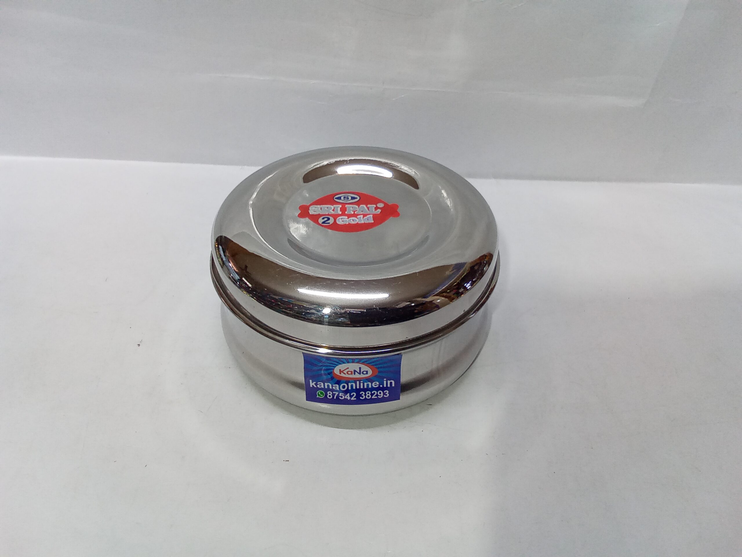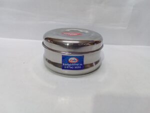 stainless steel bulging puri dabba (storage container).