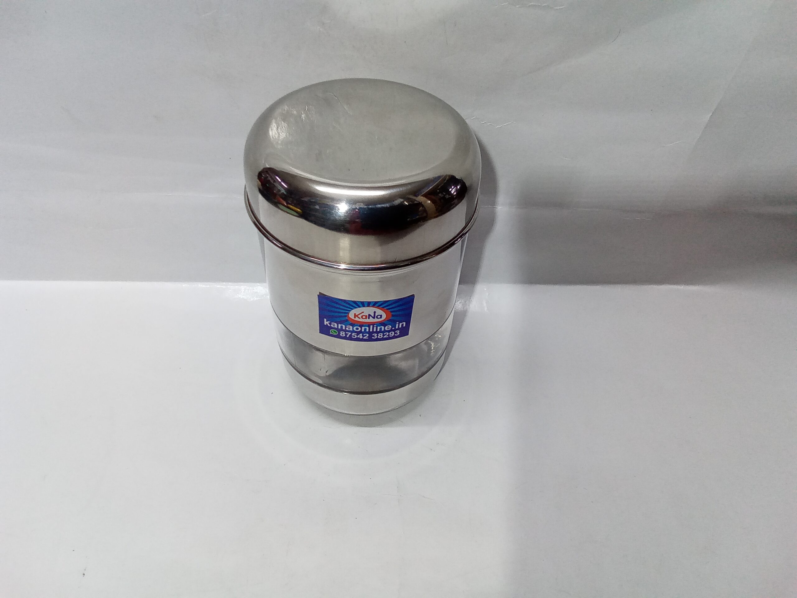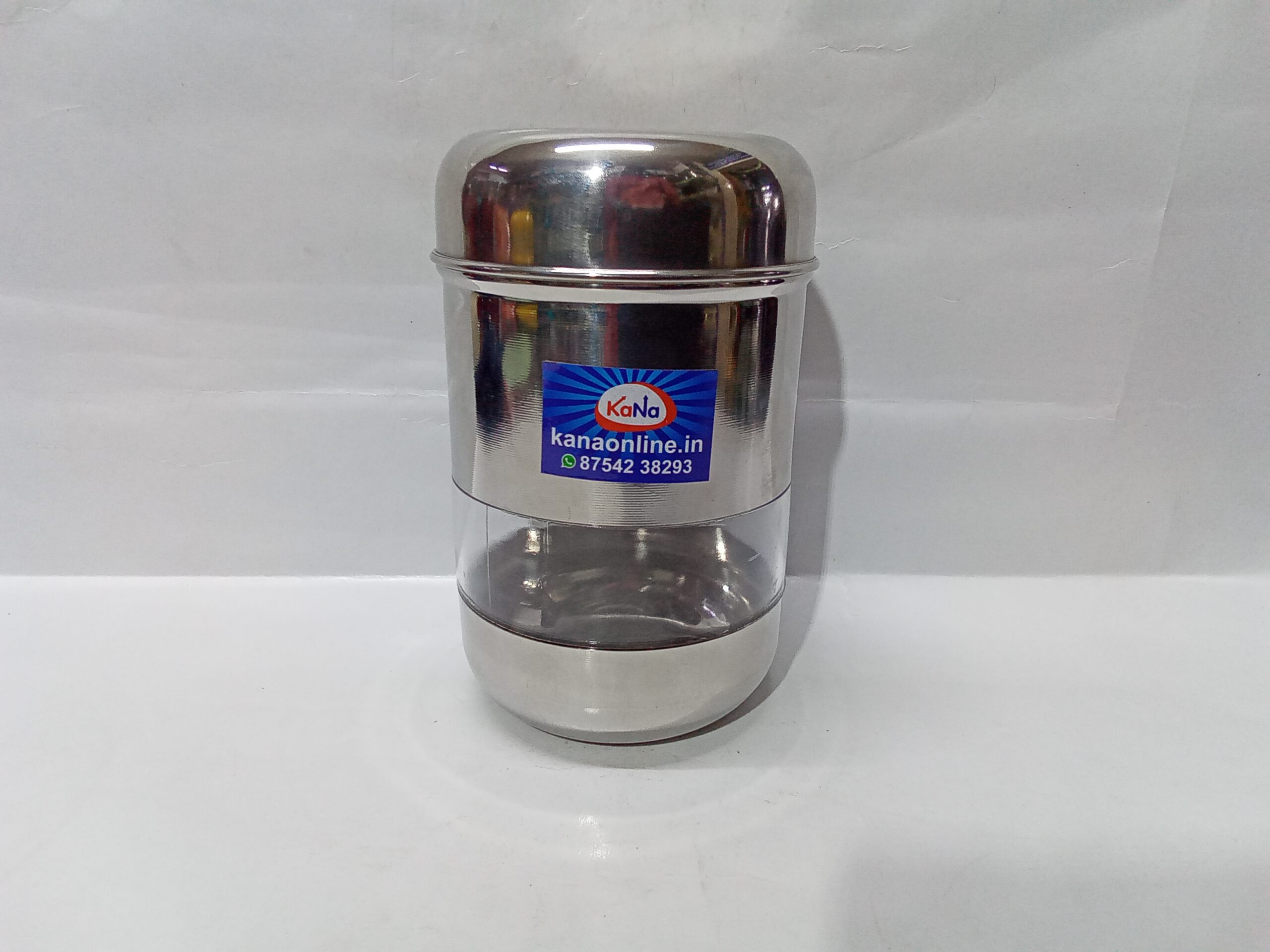 stainless steel and transparent acrylic food storage canister, often used in kitchens.Â