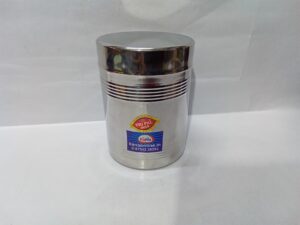 stainless steel storage container . These types of containers, often called “dabbas” or canisters in India, are widely used for kitchen storage of dry goods like spices, grains, and snacks.