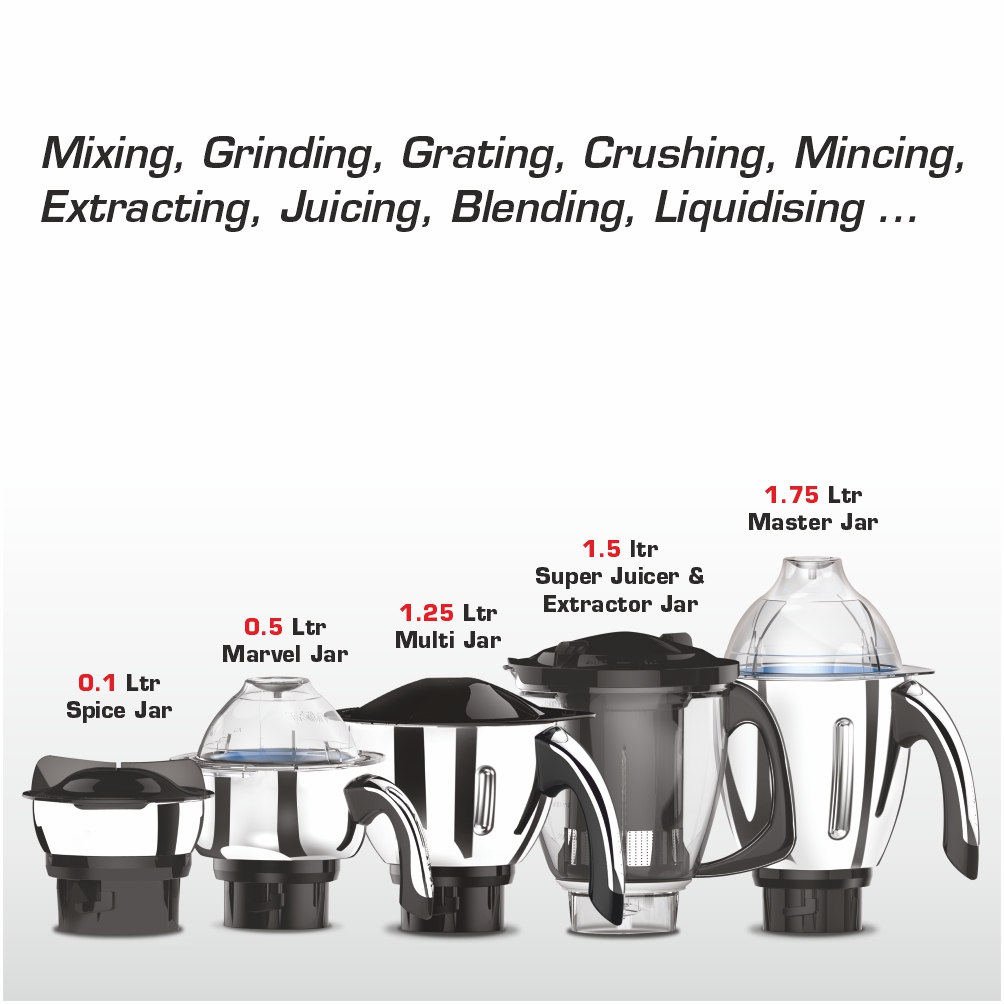 Versatile Functions: From mixing and grinding to grating, crushing, juicing, blending, liquidising, extracting, thick & thin slicing, chopping, mincing, coconut grating, atta kneading, to citrus juicing, this appliance handles it all, making it your go-to kitchen companion.